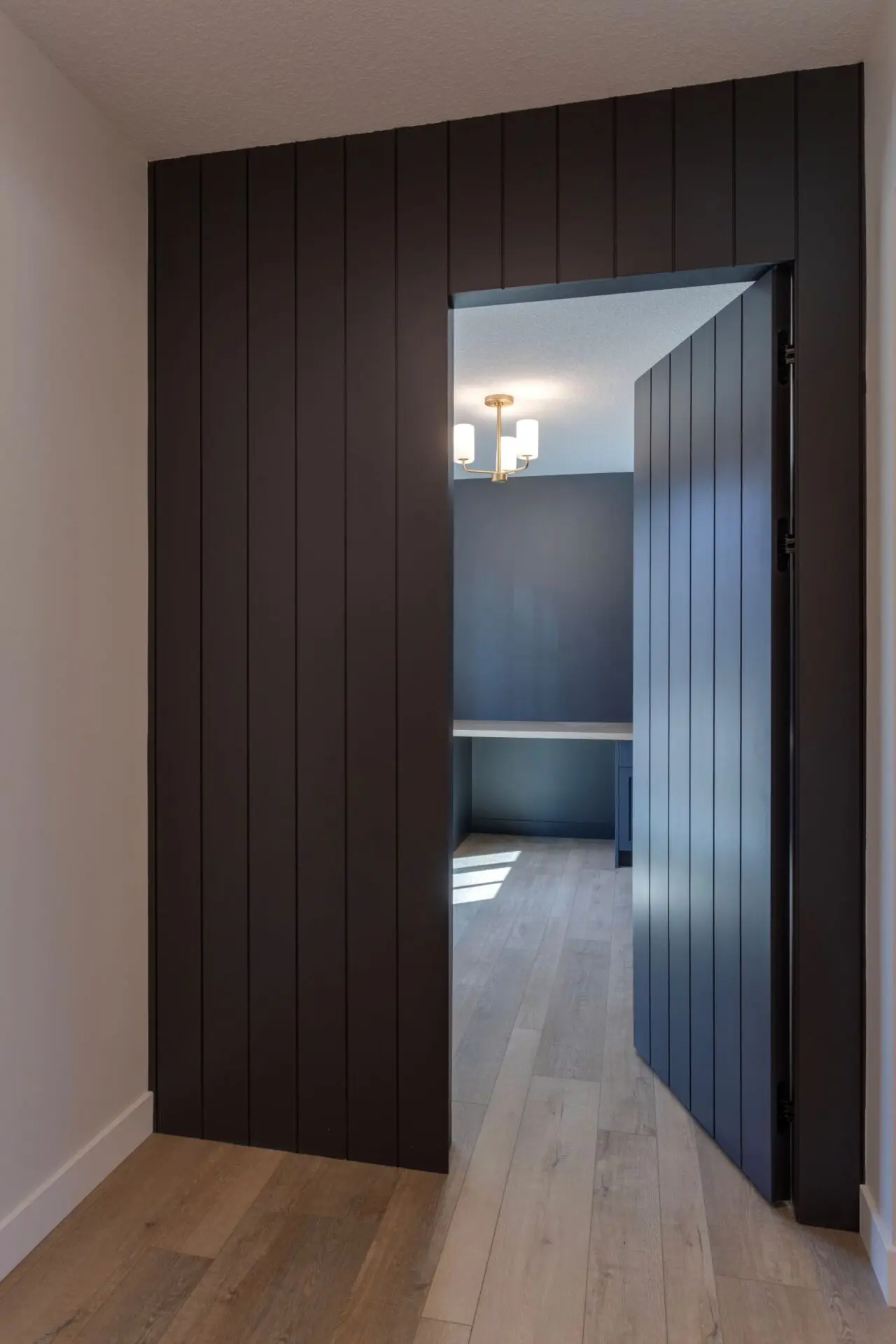 A private office was added, complete with a custom built-in desk and a dramatic dark finish that contrasts beautifully with the natural light streaming through large windows. This tucked-away workspace is accessed by a sleek hidden door, providing privacy without sacrificing style.